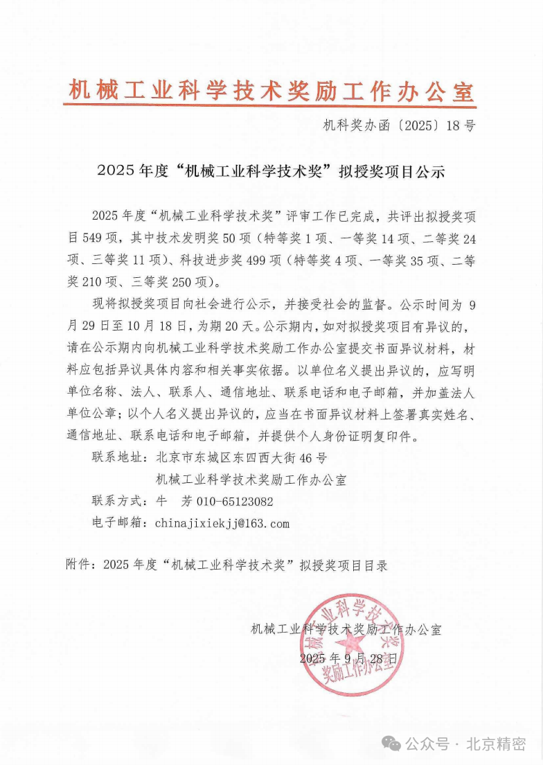 2025年度“機械工業(yè)科學技術(shù)獎”評審工作已完成,共評出擬授獎項目549項,其中技術(shù)發(fā)明獎50項(特等獎1項、一等獎14項、二等獎24項、三等獎11項)、科技進步獎499項(特等獎4項、一等獎35項、二等獎210項、三等獎250項)。