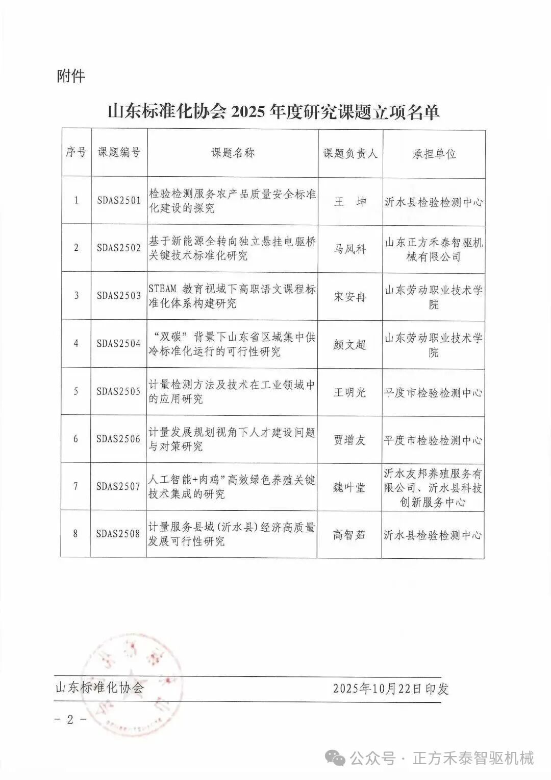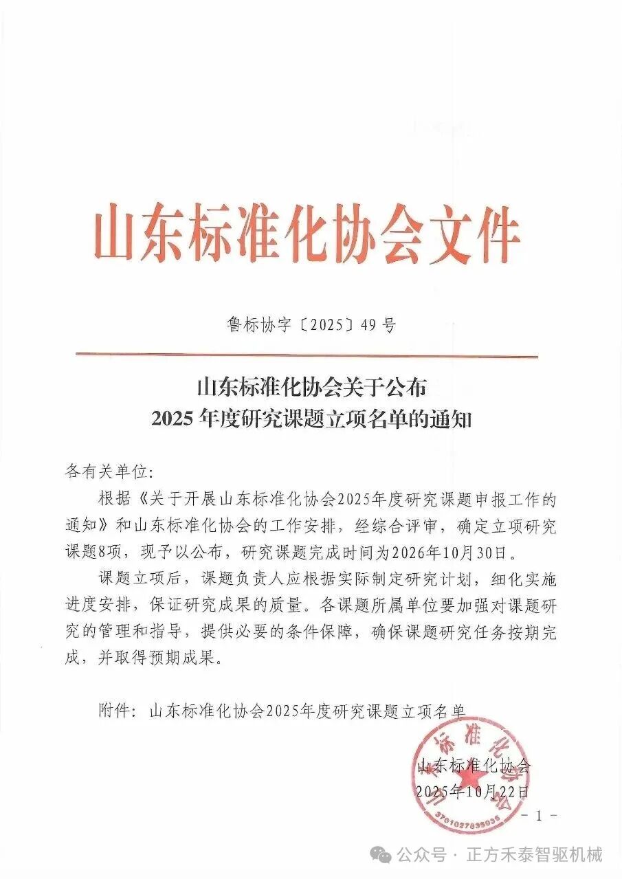 2025年10月22日,根據《關于開展山東標準化協會2025年度研究課題申報工作的通知》和山東標準化協會的工作安排,經綜合評審,正方禾泰研發的基于新能源全轉向獨立懸掛電驅橋關鍵技術標準化生產項目確定立項研究課題,現予以公布,研究課題完成時間為2026年10月30日。