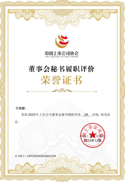 此外,在中上協(xié)發(fā)布“2025上市公司董事會秘書履職評價”結(jié)果中,于麗娜女士憑借全面的專業(yè)素養(yǎng)及優(yōu)秀的履職表現(xiàn),連續(xù)兩年獲評該評價最高級別——“5A評級”。