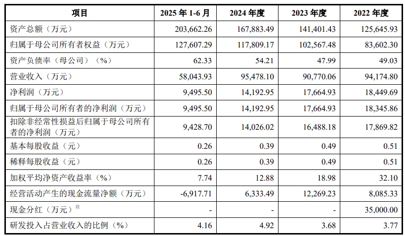 據公告顯示,報告期各期,公司營業收入分別為 94,174.80 萬元、90,770.06 萬元、95,478.10 萬元和 58,043.93 萬元;凈利潤分別為 18,449.69 萬元、17,664.93 萬元、14,192.95 萬元和 9,495.50 萬元。2024 年度,公司凈利潤同比有所下降。