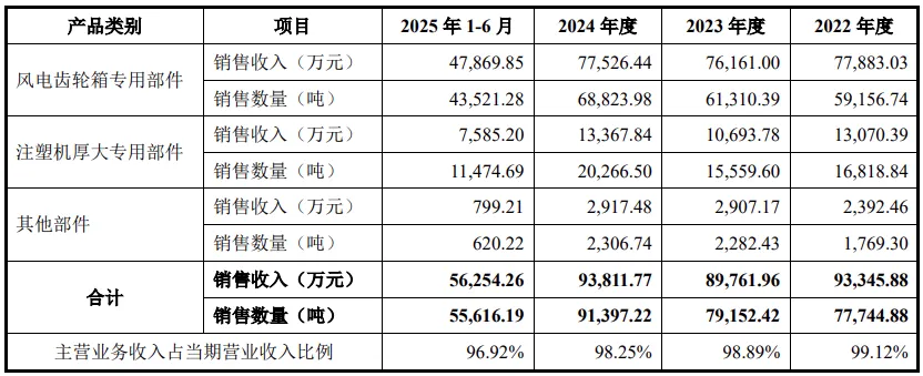 2022 年度至 2024 年度,公司主要產品銷量整體呈上升趨勢、主營業務收入穩中有升。2025 年 1-6 月,公司主要產品銷量及主營業務收入均大幅增長,分別達到55,616.19噸及56,254.26萬元,較去年同期增長36.44%及34.04%。報告期內,公司主營業務收入占當期營業收入的比例均在 96%以上,主營業務突出,具體情況如下: