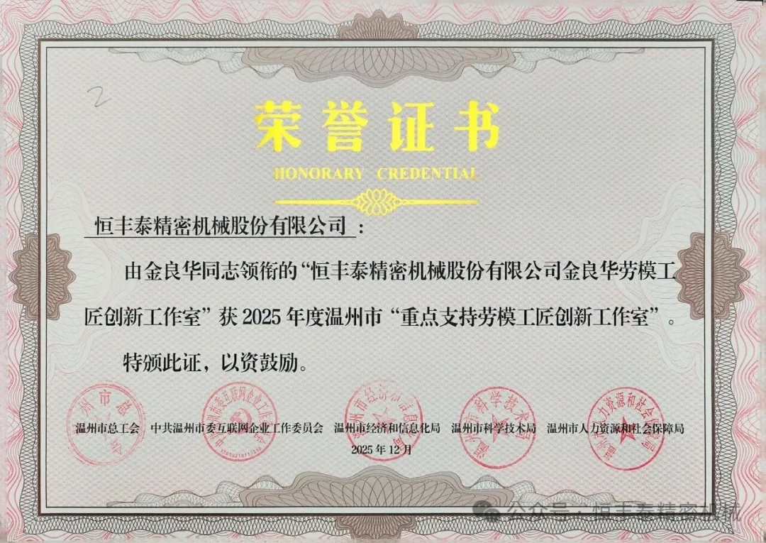 近日,恒豐泰金良華勞模工匠創新工作室榮獲2025年度溫州市“重點支持勞模工匠創新工作室”稱號。此項榮譽由溫州市總工會、中共溫州市委互聯網企業工作委員會、溫州市經濟和信息化局等主管單位聯合授予,不僅是對工作室在技術創新與高技能人才培養方面突出貢獻的權威認可,更是對新時代工匠精神與產業創新深度融合的生動詮釋。