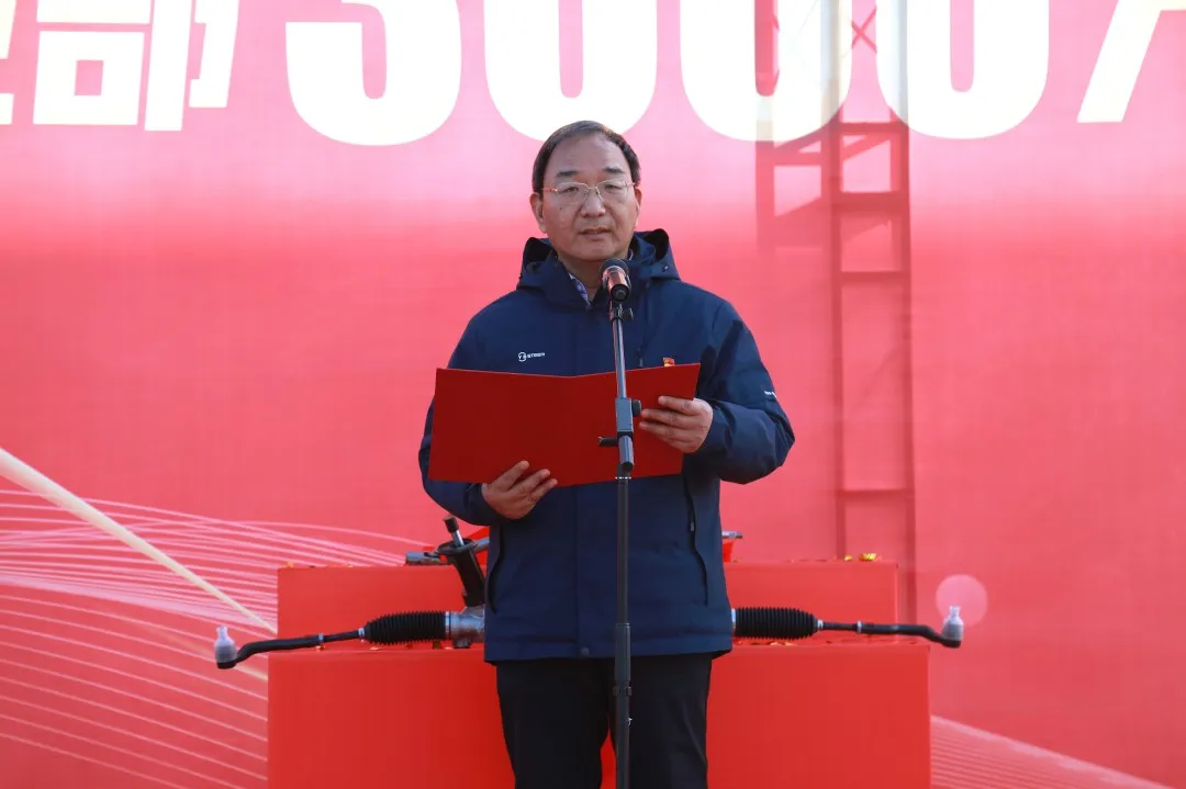 伴隨著歡樂與喜悅的氛圍,公司董事長張崇峻和總經理余大進共同上臺,為第3000萬臺轉向器的下線儀式進行揭幕。這不僅是對過去努力與成就的慶祝,更是對未來征程的期許與啟航。