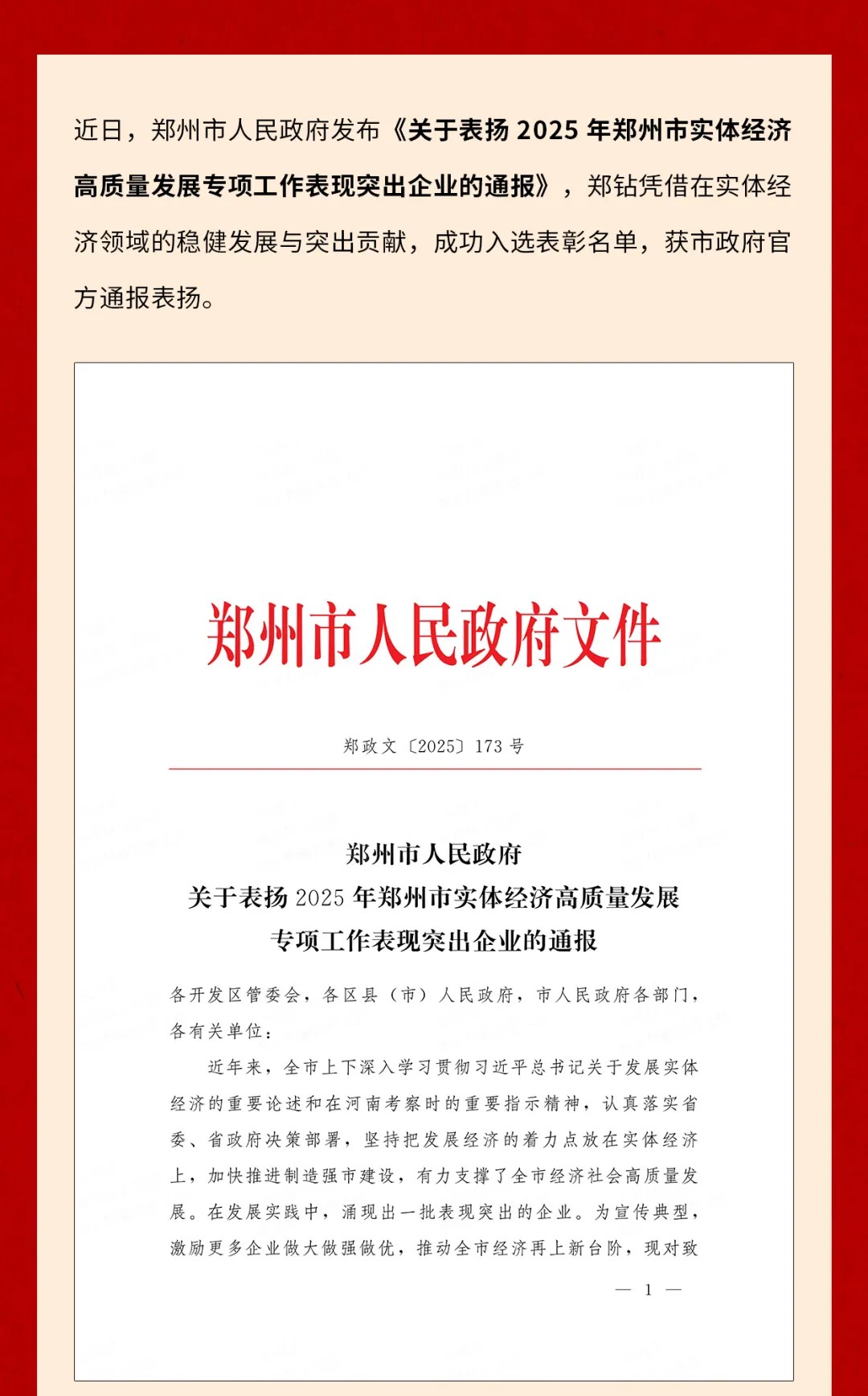 近日,鄭州市人民政府發布<<關于表揚2025年鄭州市實體經濟高質量發展專項工作表現突出企業的通報>>,鄭鉆憑借在實體經濟領域的穩健發展與突出貢獻,成功入選表彰名單,獲市政府官方通報表揚。