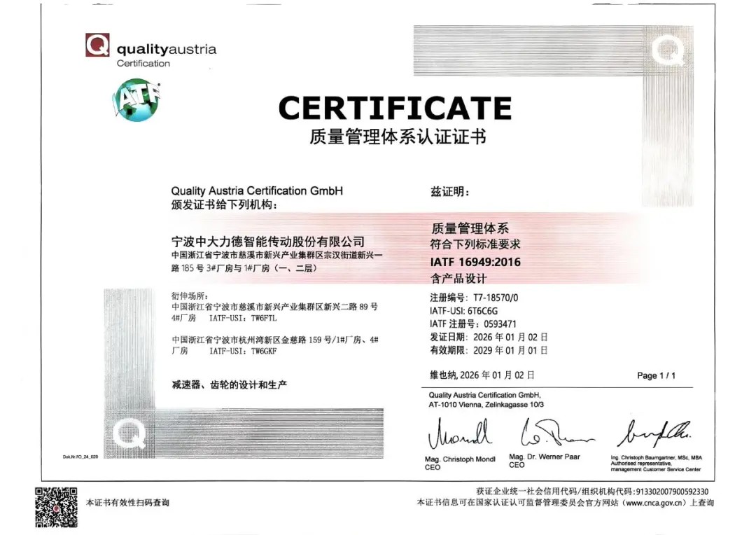 近日,寧波中大力德智能傳動股份有限公司成功通過IATF16949:2016質量管理體系認證,并獲得認證證書。
