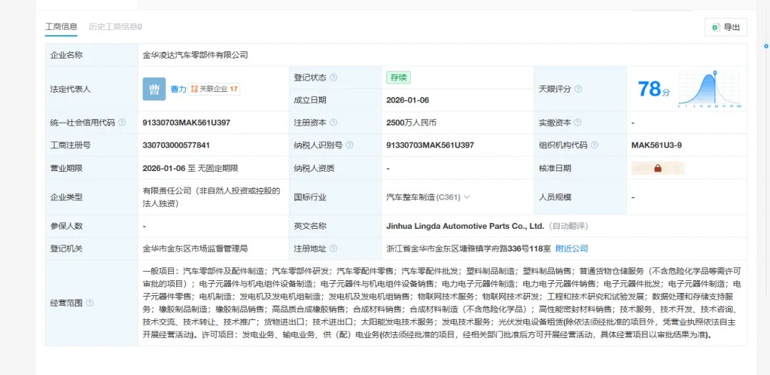 近日,金華凌達汽車零部件有限公司成立,法定代表人為曹力,注冊資本2500萬元。
