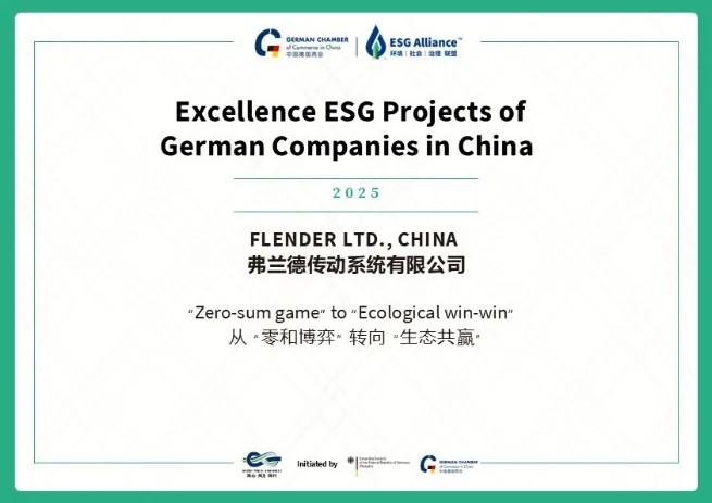 2025年,弗蘭德傳動系統有限公司憑借“零和博弈轉向生態共贏”與“藍色助夢,三載同行”兩大項目,榮獲“2025年德國在華企業卓越ESG項目獎”。 該獎項由ESG聯盟與中國德國商會(German Chamber of Commerce in China)聯合組織,并由德國上海總領事館(Consulate General of the Federal Republic of Germany in Shanghai)與中國德國商會共同發起,旨在表彰德國企業在華優秀的企業社會責任與可持續發展實踐,展現企業在可持續發展領域的深度探索。