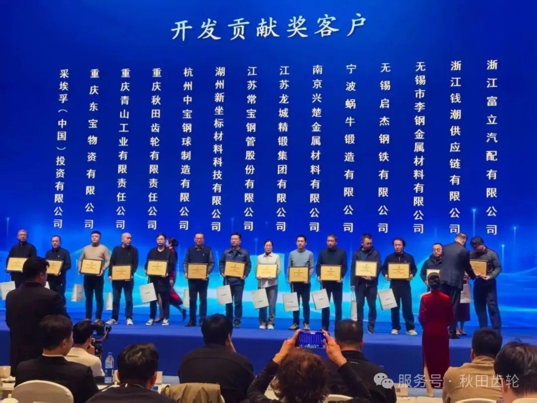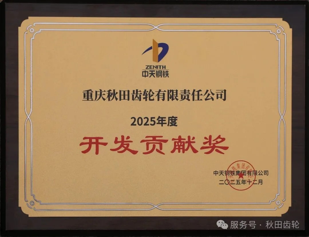 近日,在中天鋼鐵集團2026年度優特鋼銷售戰略客戶洽談會上,秋田齒輪憑借卓越的產品研發能力、技術創新成果以及對中天鋼鐵新產品開發的重要貢獻,榮獲“2025年度開發貢獻獎”。