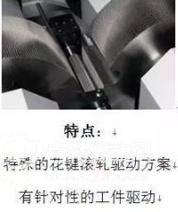 寶飛螺工程師的最新發明之一是ROLLEX技術基礎上使用圓滾軋模具滾軋加工花鍵和螺紋滾壓一樣,其最大優點是在圓滾輪可實現的無限長的滾壓長度,結果是更高的精度和十分短的換件時間,作為開發的先鋒,寶飛螺還實現了空心件花鍵滾軋的工業化。