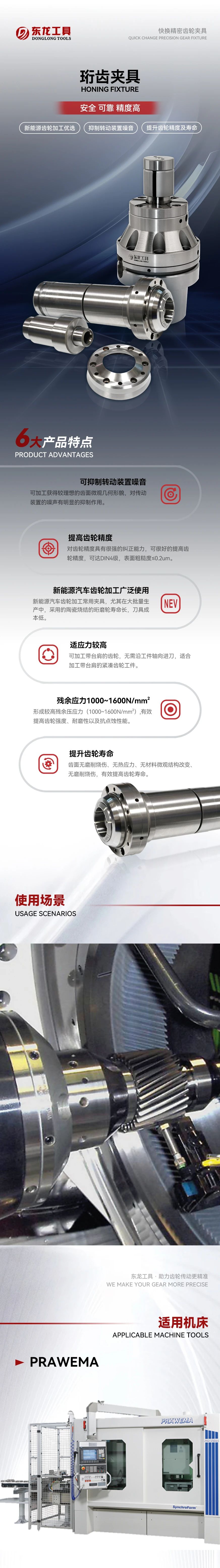 珩齒夾具的適用范圍廣泛,包括機械制造、汽車制造、航空航天等多個行業(yè)。特別適用于新能源制造業(yè)的齒輪精加工,包括珩齒工藝中的工件夾持。珩齒工藝能夠獲得理想的齒面微觀幾何形貌,對傳動裝置的振動噪音有非常明顯的抑制作用,因此在汽車齒輪、航空發(fā)動機齒輪等精密加工中得到廣泛應(yīng)用。隨著數(shù)控技術(shù)的發(fā)展和自動化生產(chǎn)的需求增加,珩齒夾具的應(yīng)用前景將更加廣闊。