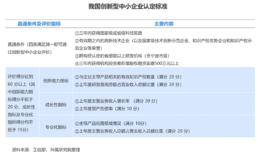 申報標準:創新型中小企業的認定包括“直通車”和“評價指標”兩種方式,若企業不滿足直通條件中任何一條,還可通過指標評價進行申報。“評價指標”的考核維度包括創新能力、成長性、專業化三類六個指標,評價得分達到 60 分以上(其中創新能力指標得分不低于 20 分、成長性指標及專業化指標得分均不低于 15 分)即可通過創新型中小企業申報。