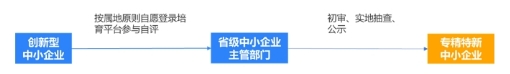 申報流程:由優質中小企業按屬地原則自愿登錄培育平臺參與自評,省級中小企業主管部門根據評價標準,組織對企業自評信息和相關佐證材料進行審核、實地抽查和公示。公示無異議的,由省級中小企業主管部門公告為創新型中小企業。