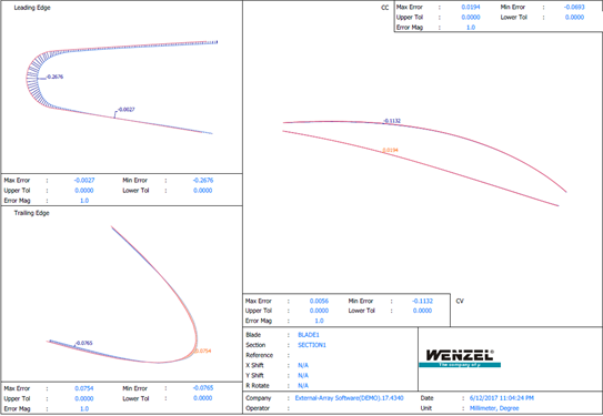 該型葉片共計需要測量11個檔位,其中中間檔位的出氣邊(Trailing Edge)R僅為0.13mm,角向定位面的寬度僅為2.5mm。