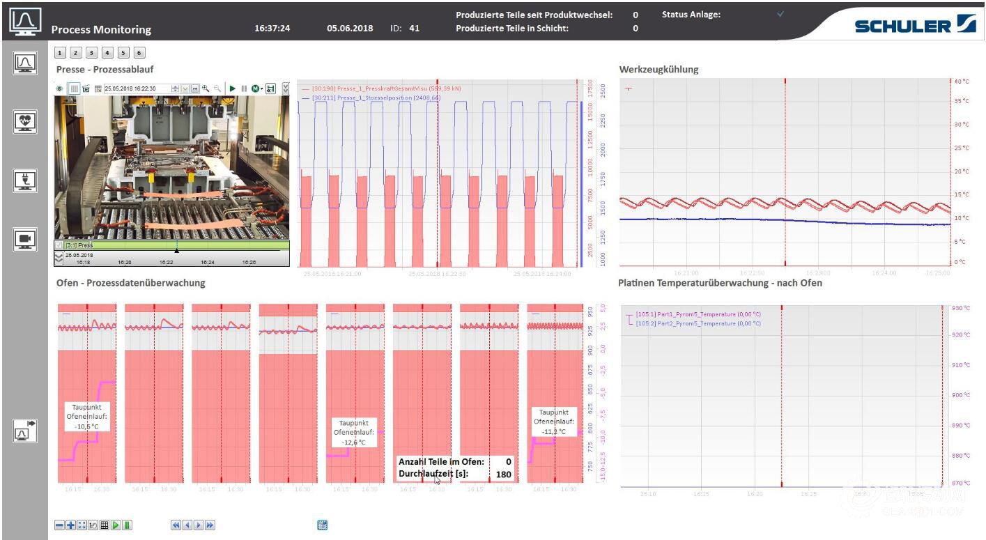 舒勒通過軟件實現聯網的首個設備是其位于格平根總部熱沖壓技術中心的熱沖壓生產線。該生產線利用熱成像攝像機與視頻對料片上料、傳輸、卸料情況實時監控,同時系統對工藝流程數據進行不間斷記錄(即“工藝流程監控”)。在壓力機、模具、加熱爐和冷卻單元中安裝有大量的傳感器以用于信息采集。這些功能強大的傳感器能夠以幾分之一秒一次的頻率探測到關于溫度、壓力、振動特性以及流速的最微小變化。