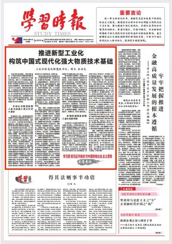 習(xí)近平總書記指出,新時(shí)代新征程,以中國式現(xiàn)代化全面推進(jìn)強(qiáng)國建設(shè)、民族復(fù)興偉業(yè),實(shí)現(xiàn)新型工業(yè)化是關(guān)鍵任務(wù)。黨的二十大報(bào)告明確提出,到2035年基本實(shí)現(xiàn)新型工業(yè)化。全國新型工業(yè)化推進(jìn)大會(huì)對新型工業(yè)化重點(diǎn)任務(wù)作出全面部署,強(qiáng)調(diào)堅(jiān)持走中國特色新型工業(yè)化道路,加快建設(shè)制造強(qiáng)國。工業(yè)和信息化系統(tǒng)要堅(jiān)持用習(xí)近平新時(shí)代中國特色社會(huì)主義思想凝心鑄魂,深入學(xué)習(xí)貫徹習(xí)近平總書記關(guān)于新型工業(yè)化的重要論述,全面貫徹落實(shí)黨的二十大精神和黨中央決策部署,牢記“國之大者”,增強(qiáng)歷史主動(dòng),奮力譜寫推進(jìn)新型工業(yè)化新篇章。