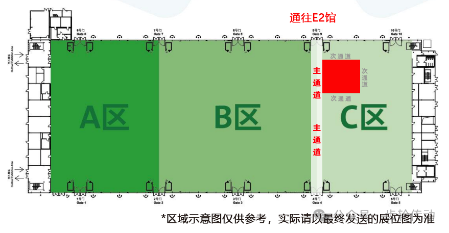 展區位置:展位號:E1-H6,展區位于E1館B區與C區之間主通道位置,展區為四面開口,四面均為通道。見下圖。