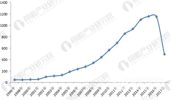 圖表1:1996-2017年汽車變速箱相關專利申請數量變化圖(單位:件)