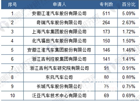 圖表3:截止2017年底汽車變速箱行業相關專利申請人前10排名(單位:件