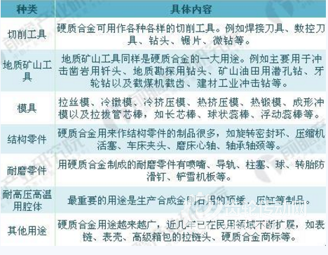 硬質合金按用途分類可分為切削工具、地質礦山工具、模具、結構零件、耐磨零件、耐高壓高溫用腔體和其他用途。