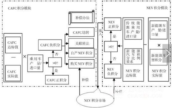 圖 1 為雙積分考核流程。從圖 1 可看出,該管理辦法可分為 CAFC 積分和 NEV 積分兩個主要模塊,兩大模塊又通過新能源積分市場產生相互關聯。CAFC 積分不達標的企業可從新能源積分市場購買 NEV 積分來補償自身的 CAFC 負積分,而有 NEV 盈余的企業則可出售 NEV 積分來獲利[4]。