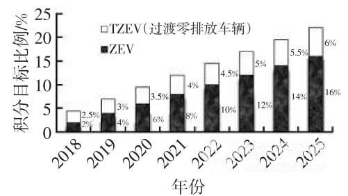 上世紀 90 年代美國加州頒布加州零排放汽車(Zero Emission Vehicle,ZEV)法案 [6]。該法案表明,在加州汽車銷售量達 4500 輛以上的企業必須滿足一定的零排放車輛信用額度積分要求。企業傳統能源汽車銷量乘以年度 ZEV/TZEV(過渡零排放車輛)積分目標比例(圖 2)為企業 ZEV 積分目標。