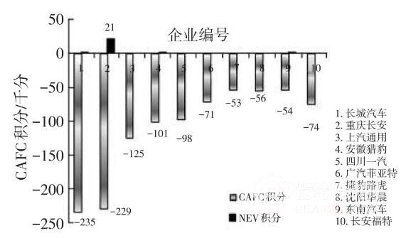 選取 CAFC 負積分最多的 10 家未達標企業(圖 5)分析發現,首先,未達標企業以 SUV 車型為主,因車型結構不合理使得其 CAFC 負積分偏高;其次,未達標企業在新能源汽車領域少有業績,除少數企業獲得 NEV 積分外,其余車企 NEV 積分為零,無法借助 NEV 積分抵消 CAFC 負積分。對于部分未達標企業可以利用集團內部在關聯企業間積分轉讓、交易的方式進行負積分抵償。一些獨立企業如長城汽車必須調整產品計劃,使預期產生的正積分能夠抵償其負積分。