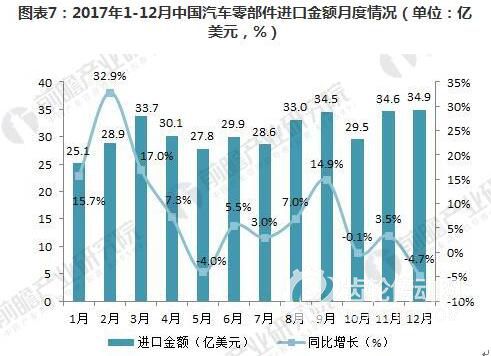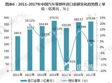 2011-2017年,我國汽車零部件進口金額呈現波動變化的趨勢。2017年,我國汽車零部件累計進口金額為370.48億美元,較上年同比增長1.9%,進口額進一步增加。