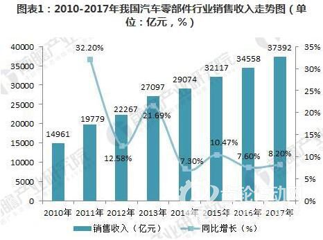近年來,中國汽車零部件行業市場規模的發展速度趨于穩定。根據中國汽車工業協會統計數據顯示,2017年,我國汽車零部件制造企業實現銷售收入37392億元,同比增長8.20%。