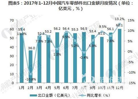 從月度汽車零部件出口金額同比變化情況來看,2月、8月出口金額同比有所下降,其他各月均呈增長,但除1月和12月外,各月增速均低于10%。