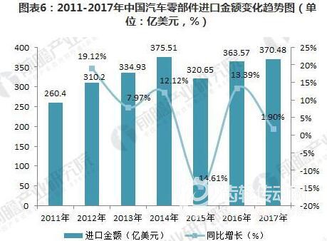 2011-2017年,我國汽車零部件進口金額呈現波動變化的趨勢。2017年,我國汽車零部件累計進口金額為370.48億美元,較上年同比增長1.9%,進口額進一步增加。