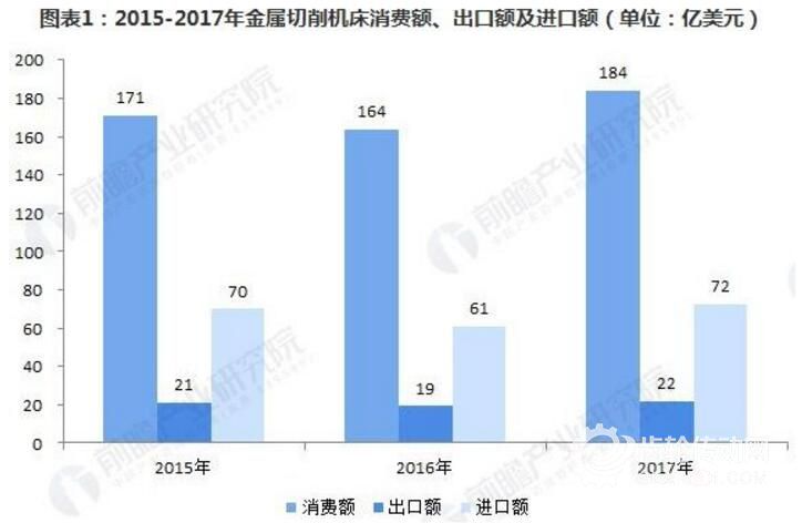 近年來隨著我國產業結構調整成效顯現以及全球經濟回暖等因素,金屬切削機床市場需求進一步提升,2017年,我國金屬切削機床消費額184億美元,同比增長7.8%;出口21.8億美元,同比增長13.2%;進口72.3億美元,同比增長18.4%。