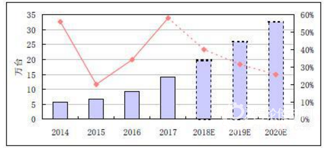 2018——2020年我國工業機器人銷售量及同比增速預測