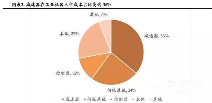 根據(jù)機(jī)器人網(wǎng)的相關(guān)數(shù)據(jù)顯示,三大核心零部件占機(jī)器人成本的比例超過70%,其中,減速器成本占比為三大核心零部件最高者,數(shù)值為36%。