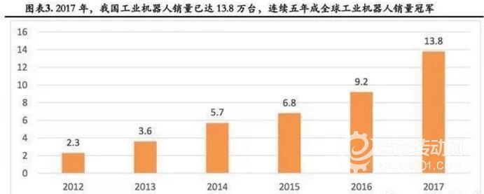 根據(jù)工控網(wǎng)數(shù)據(jù),2017年,中國工業(yè)機(jī)器人銷量增至13.8萬臺(tái),連續(xù)五年成為全球工業(yè)機(jī)器人銷量冠軍。