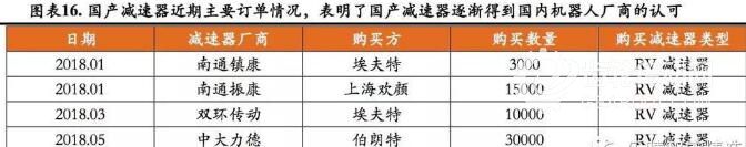 2018年1月,埃夫特、上海歡顏從南通振康分別購買了3000臺(tái)和15000臺(tái)RV減速器;3月份,雙環(huán)傳動(dòng)與埃夫特簽署了戰(zhàn)略合作協(xié)議,約定埃夫特將在雙環(huán)傳動(dòng)采購10000臺(tái)RV減速器;2018年5月,伯朗特與中大力德簽訂迄今為止最大的RV減速器戰(zhàn)略框架合同,約定在2019年12月前采購不低于30000臺(tái)RV減速器。