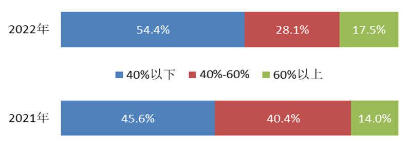 從利潤率的分布看,2022年度利潤率在0%以下的企業占8.8%,占比下降5.3個百分點;位于0%-10%之間的企業占36.8%,占比上升8.8個百分點;位于10%-15%之間的企業占14.0%,占比上升3.5個百分點;位于15%以上的企業占40.4%,占比下降7.0個百分點。整體分布明顯往中間兩個區域集中。利潤率的整體分布情況見圖4。