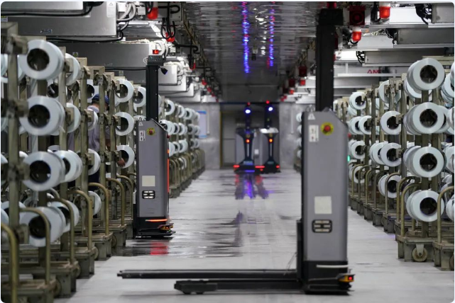 5月18日,在河北沙河市一家玻璃新材料企業(yè),智能搬運(yùn)車在車間工作。田曉麗 攝