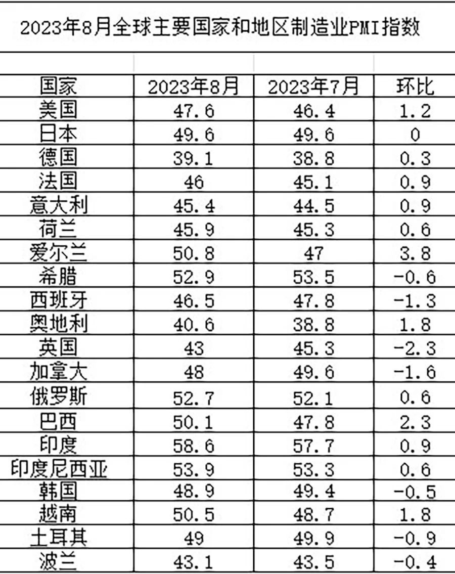 2023年8月份,歐洲制造業PMI為44.7%,較上月下降0.1個百分點,連續7個月環比下降,連續13個月在50%以下。從主要國家來看,俄羅斯制造業繼續保持較快增長,增速較上月有所加快,PMI升至52.7%;德國、法國和意大利制造業PMI較上月均有小幅上升,但均在較低水平,德國制造業PMI仍在40%以下;英國制造業PMI降至43%,環比降幅超過2個百分點。