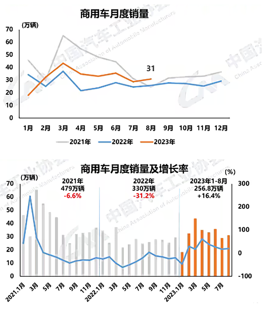 8月,商用車產銷分別完成30萬輛和31萬輛,環比分別增長5%和7.9%,同比分別增長26.2%和20%。在商用車主要品種中,與上月相比,客車、貨車產銷均呈不同程度增長,其中貨車產銷增速更為明顯;與上年同期相比,客車、貨車產銷均呈增長,其中貨車產銷增速高于客車。