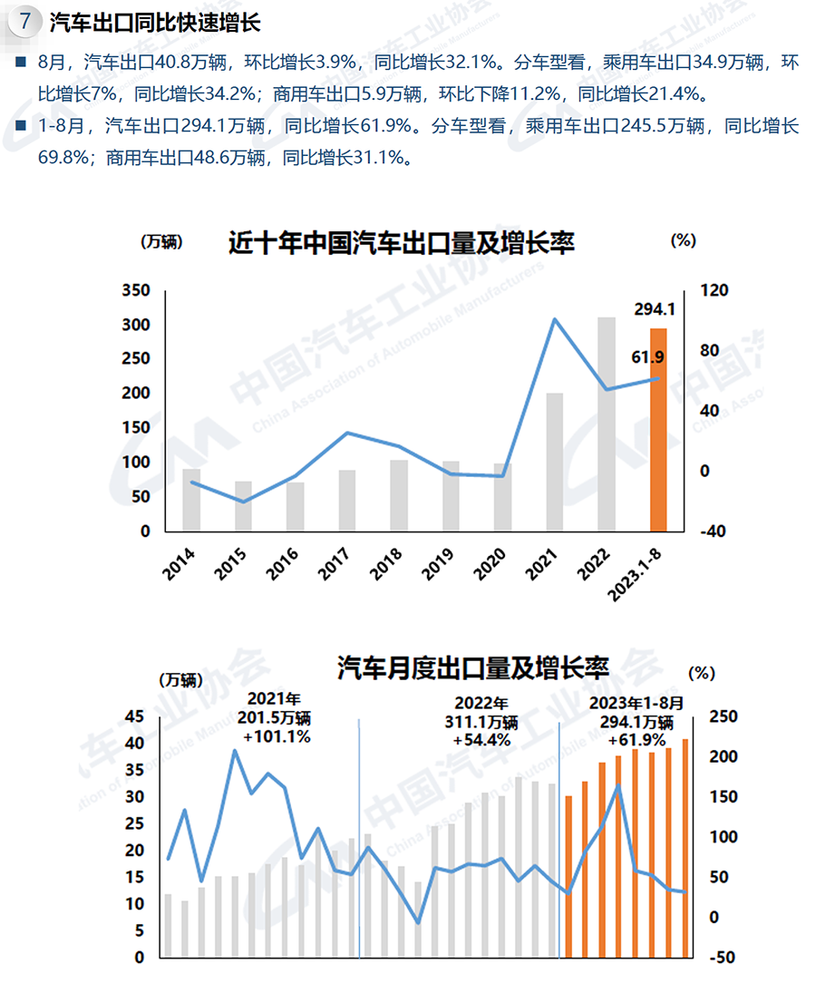 8月,汽車產銷分別達到257.5萬輛和258.2萬輛,環比分別增長7.2%和8.2%,同比分別增長7.5%和8.4%。1-8月,汽車產銷累計完成1822.5萬輛和1821萬輛,同比分別增長7.4%和8%。