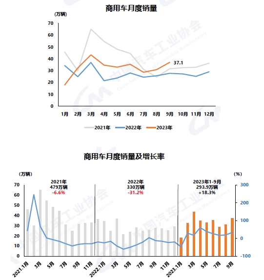 9月,商用車產銷分別完成35.4萬輛和37.1萬輛,環比分別增長17.9%和19.8%,同比分別增長34.6%和33.2%。在商用車主要品種中,與上月相比,客車、貨車產銷均呈兩位數增長;與上年同期相比,客車、貨車產銷均呈不同程度增長。
