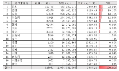 表1 2023年1-9月經(jīng)鍍或涂層的硬質(zhì)合金制的金工機(jī)械用刀及片(82081011)進(jìn)口來源地統(tǒng)計