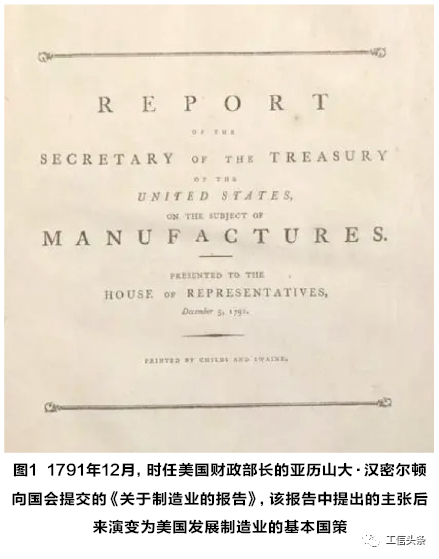 美國獨立之初,面對英國的打壓,對發展制造業仍存在很大的分歧——出生于弗吉尼亞州的一位開國元勛托馬斯·杰斐遜習慣并喜愛傳統的南方莊園生活,希望維持世外桃源式的農業社會;另一位開國元勛亞歷山大·漢密爾頓則堅持美國必須擁有強大的工業,并于 1791 年 12 月向國會提交了著名的《關于制造業的報告》。在這份報告中,漢密爾頓指出,每個國家都應該把人民生活所需要的衣、食、住、行等生活物資的生產掌握在自己的手里,必須發展制造業,因為制造業的發展與國家真正意義上的獨立是密切相關的,是一個國家經濟獨立的基礎和前提。當時美國的社會經濟由依附于英國的種植園主和大商人主導,漢密爾頓的提議并未受到重視。盡管托馬斯·杰斐遜“農業立國”的主張起初受到歡迎,但殘酷的現實讓美國人民最終認識到,沒有強大的制造業,就沒有國家富強的基礎。