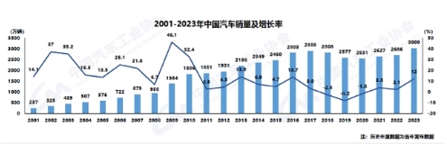 中汽協數據顯示,我國汽車產銷總量連續15年穩居全球第一。2009年,中國汽車產銷量首次雙突破1000萬輛大關,成為世界汽車產銷第一大國。2013年突破2000萬輛,2017年產銷量達到階段峰值,隨后市場連續三年下降,進入轉型調整期,2021年結束“三連降”開始回升。2023年,汽車產銷累計完成3016.1萬輛和3009.4萬輛,同比分別增長11.6%和12%。