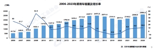 2023年,乘用車產銷累計完成2612.4萬輛和2606.3萬輛,同比分別增長9.6%和10.6%,乘用車累計產銷量均創歷史新高。在乘用車主要品種中,與上一年度相比,運動型多用途乘用車(SUV)和多功能乘用車(MPV)產銷呈兩位數增長,基本型乘用車(轎車)產銷呈小幅增長,交叉型乘用車產銷呈兩位數下降。