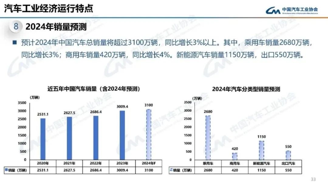 中汽協預計,2024年,中國汽車市場將繼續保持穩中向好發展態勢,汽車總銷量將超過3100萬輛,同比增長3%以上。