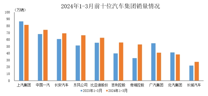 據中國汽車工業協會統計分析,2024年1-3月,汽車銷量排名前十位的企業(集團)共銷售568.9萬輛,占汽車銷售總量的84.7%。
