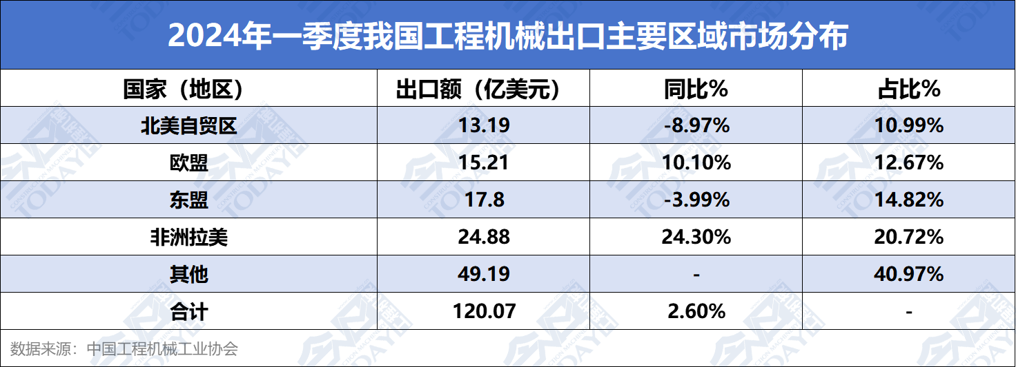 出口方面,累計出口整機85.58億美元,同比增長4.98%,占出口總額的71.3%;零部件出口34.49億美元,同比下降2.86%,占出口總額的28.7%。2024年一季度出口額增加的主要有:電動叉車及升降平臺、內燃叉車及升降平臺、非公路礦用自卸車、隧道掘進機、其他起重機、最大起重量100噸以上全路面起重機、混凝土攪拌車、其他工程車輛、混凝土泵車等。出口額減少的主要有:履帶挖掘機、零部件、壓路機、筑路機及平地機等。