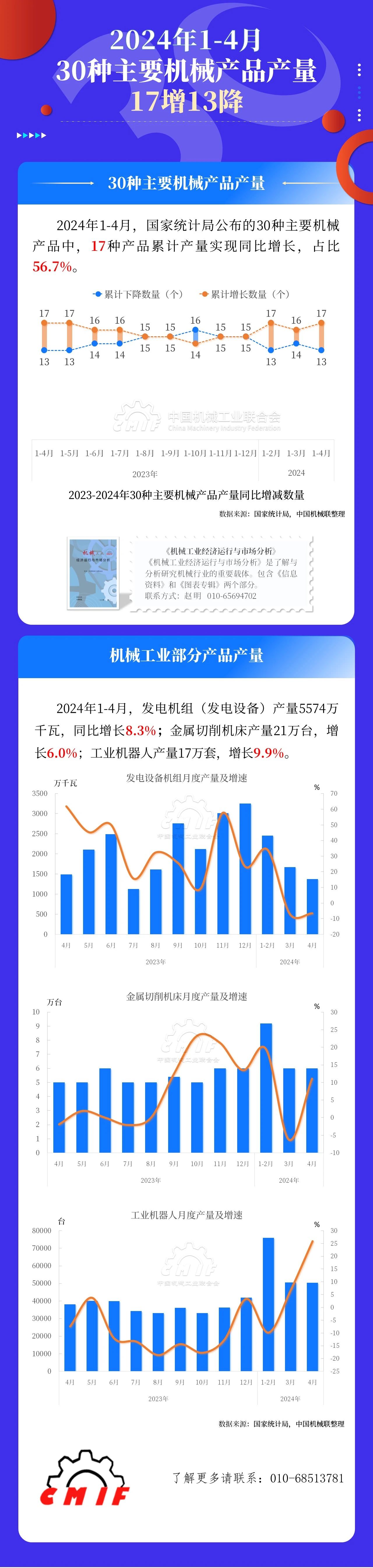 2024年1-4月,國家統(tǒng)計局公布的30種主要機械產(chǎn)品中,17種產(chǎn)品累計產(chǎn)量實現(xiàn)同比增長,占比56.7%。