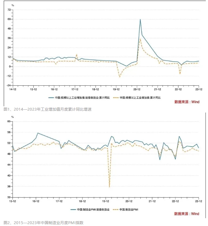 進入新時代,我國裝備制造業的產出增速以及PMI(采購經理指數)所反映的產業未來增長先行指標均處于相對較高水平。從規模以上工業增加值年均增速看,2014年以來,裝備制造業均高于全部工業平均水平;2023年1—12月累計同比增速達到6.8%,高于規模以上工業2.2個百分點(見圖1)。從PMI看,2020年以來,裝備制造業月度PMI指數在絕大多數月份均高于制造業PMI指數,并且僅在新冠肺炎疫情影響較為嚴重的2022年,裝備制造業月度PMI指數出現了低于50%的情況(見圖2)。
